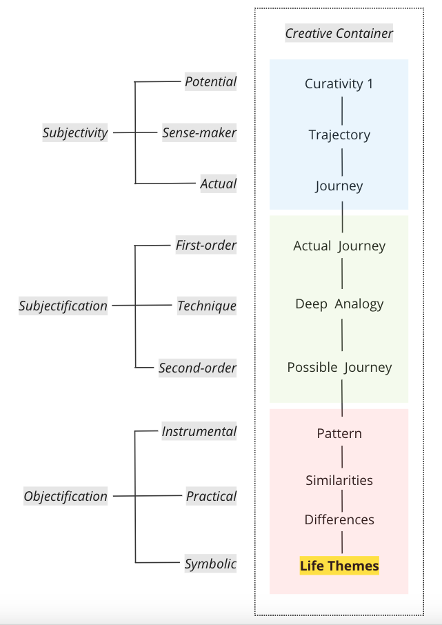 I work on several theoretical approaches. Each approach has its own way to define Subjectivity. I used the Ecological Practice approach to guide the Creative Life Curation project.