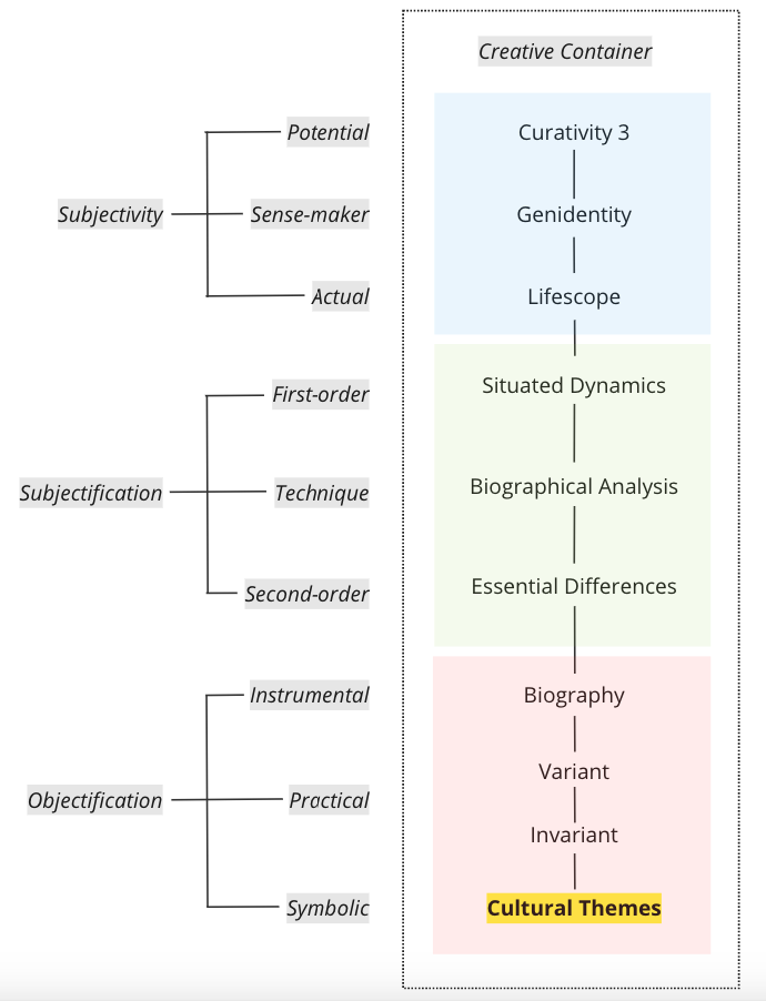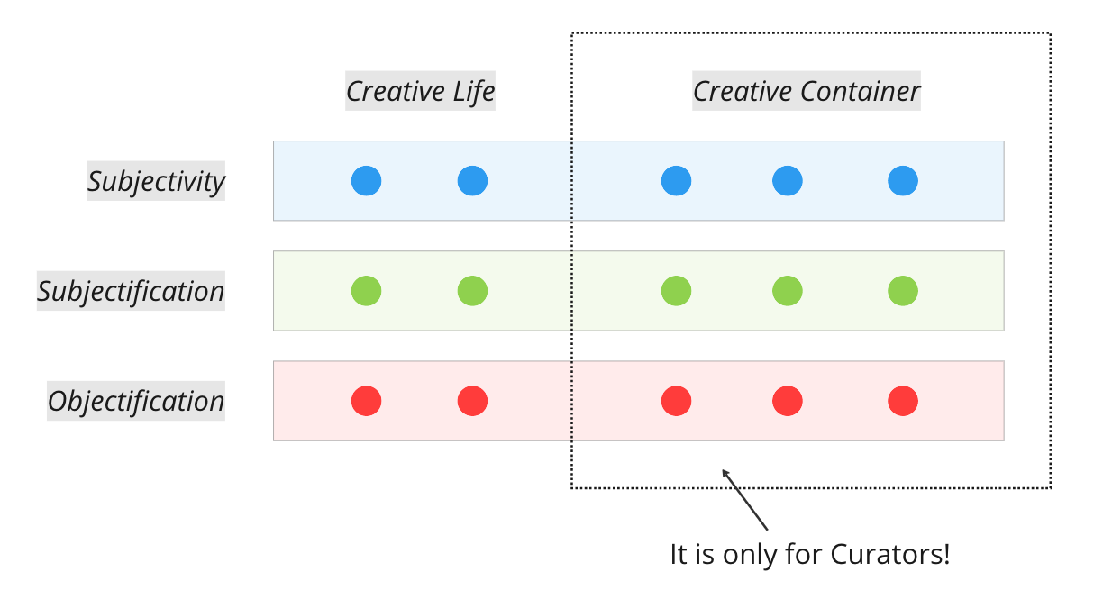 The goal of Creative Life Curation project is to turn a person's creative actions into a social collective culture. I consider symbolic objectification as the final stage of this process. See the last row.