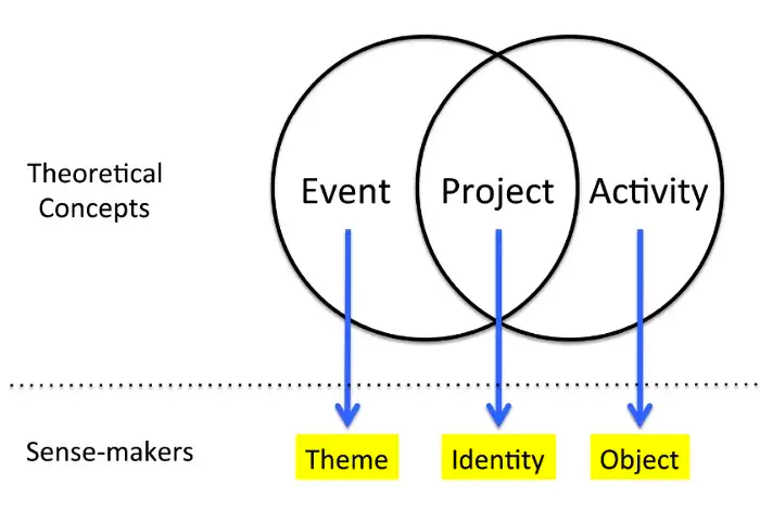 For example, Activity Theory has the key concept of Object which is a sense-maker of the theory. So, I think we can assign similar sense-makers to Project and Event. For example, I think the primary sense-maker of a Project can be Identity and the primary sense-maker of an Event can be Theme.