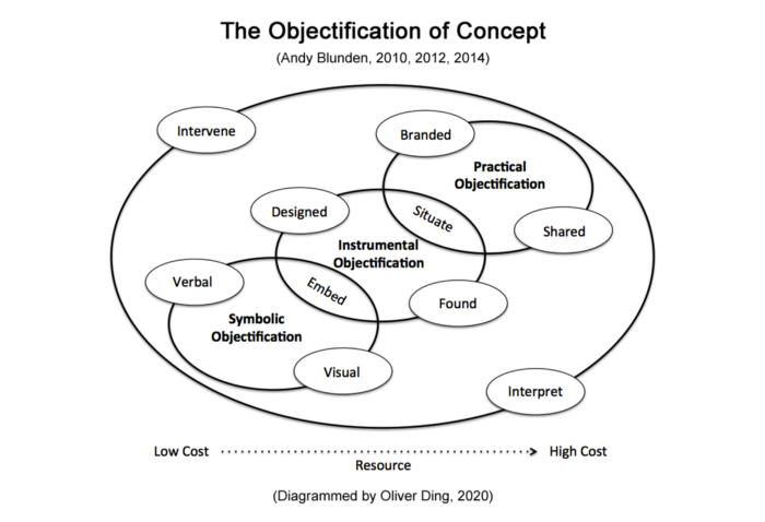 The concept of Objectification is inspired by Project-oriented Activity Theory. It represents three types of Objectification of a Concept: