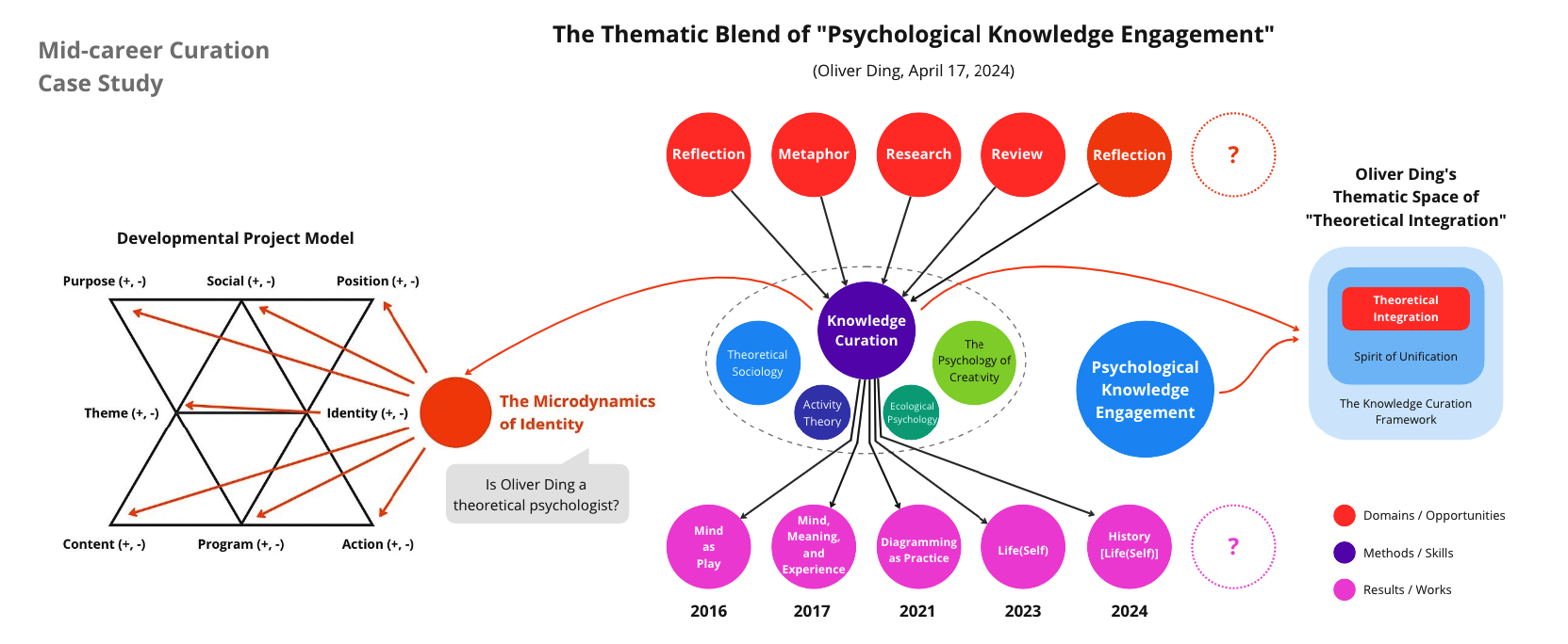 I also shared a case study of the "Thematic Identity Curation" framework. On April 17, 2024, after reflecting on the long journey, I found that there was a thematic blend of "Psychological Knowledge Engagement" in my creative journey.