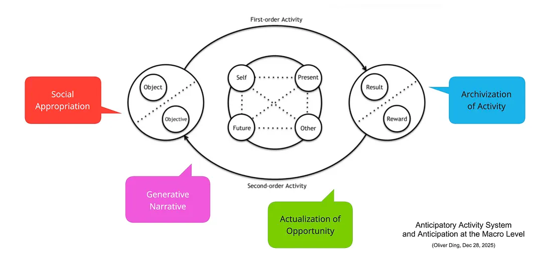 At the macro level, anticipation leads to a specific activity, encompassing a series of actions: