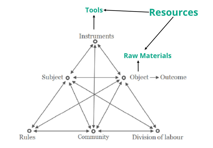 The above diagram is based on Yrjö Engeström's Activity System Model which is a popular theoretical framework of “Cultural-historical activity theory (CHAT)”.