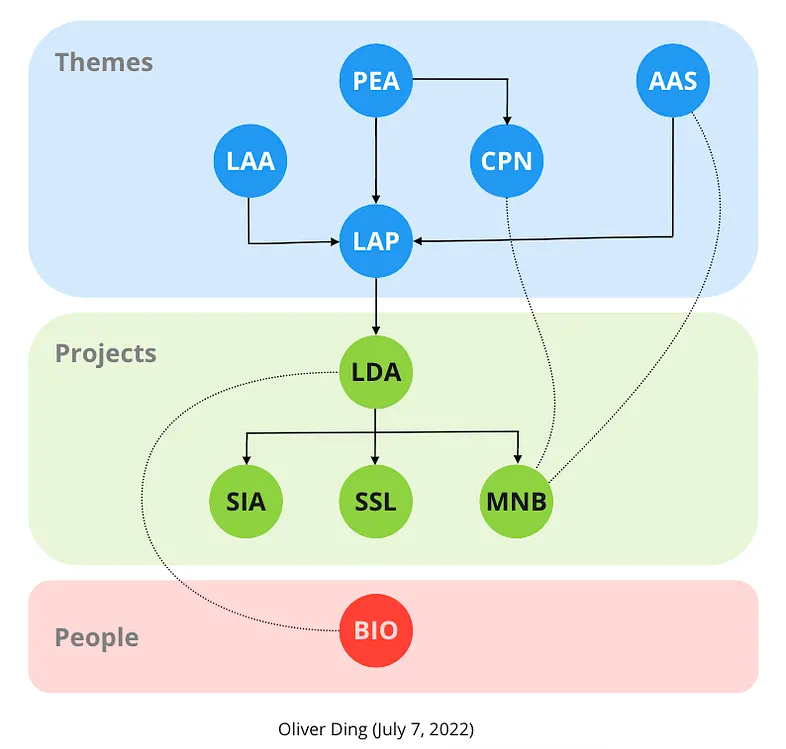 It showed three layers stacked on top of each other. The top layer, shaded blue, was labeled Themes — and inside it floated several circles: PEA, LAA, AAS, CPN, LAP. The middle layer, green, was labeled Projects — with LDA branching down into SIA, SSL, and MNB, each anchored to its platform (Coda, Lark, Milanote). The bottom layer, pink, was labeled People — a single node, BIO, connecting outward to LinkedIn and Medium.