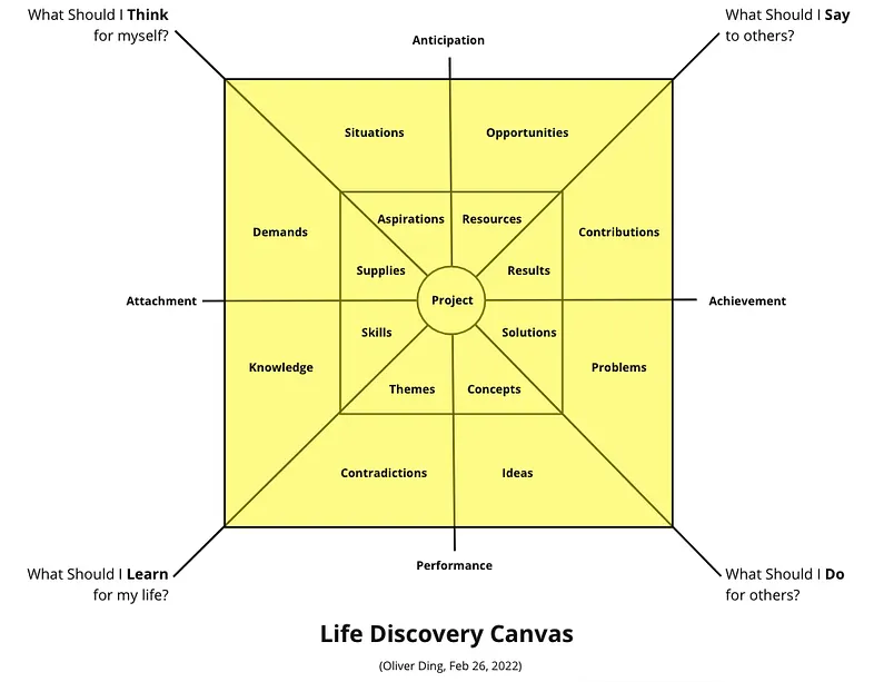 On February 27, I developed the Life Discovery Canvas (v1.0), organized around six basic principles of the project-centered approach. The canvas sat at the center of four quadrants: Think, Say, Learn, Do — and pointed outward to the surrounding ecology of any project: Situations, Opportunities, Demands, Knowledge, Problems, Ideas.
