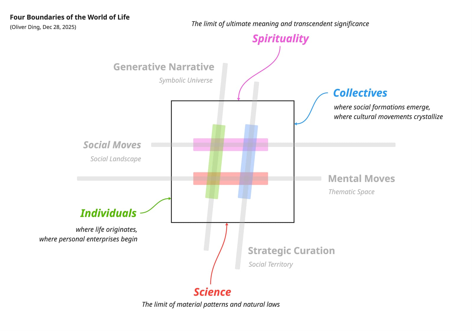 In my recent works, a central reference point is the World of Life — a framework I have been developing over the past weeks that maps the social world through four boundaries: Spirituality above, Science below, Collectives to the right, Individuals to the left. These boundaries have been generative in a particular way: they have guided a sequence of concept curation work, opening questions about where different frameworks live within this larger structure, and where they reach their limits.