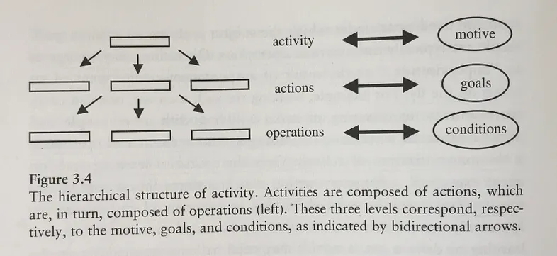Leontiev's original framework was elegant in its simplicity. Activities are driven by motives. Actions are driven by goals. Operations are driven by conditions. Three levels, two-way relationships between them, and a clear psychological logic binding the whole structure together.