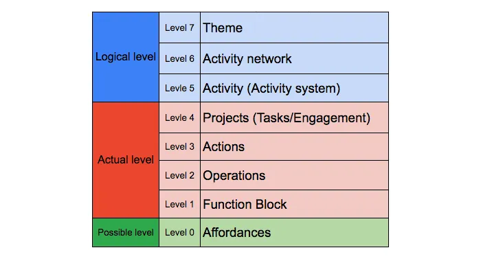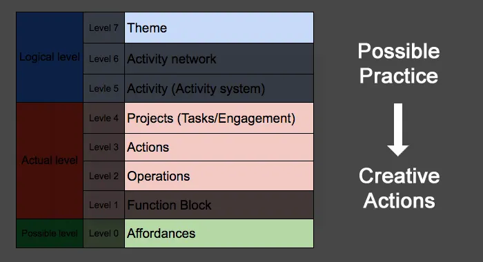 What I want to focus on in this article, however, is not the middle of that hierarchy but its two ends. The topmost level — Theme — and the bottommost level — Affordances — are precisely the two levels that reach beyond the traditional boundaries of Activity Theory. How they got there, and what that reaching means, is the story that follows.