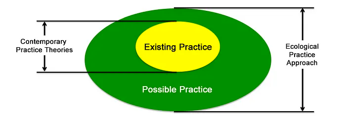 The diagram above illustrates the relationship between Contemporary Practice Theories and the Ecological Practice Approach, represented by Possible Practice, its first principle.