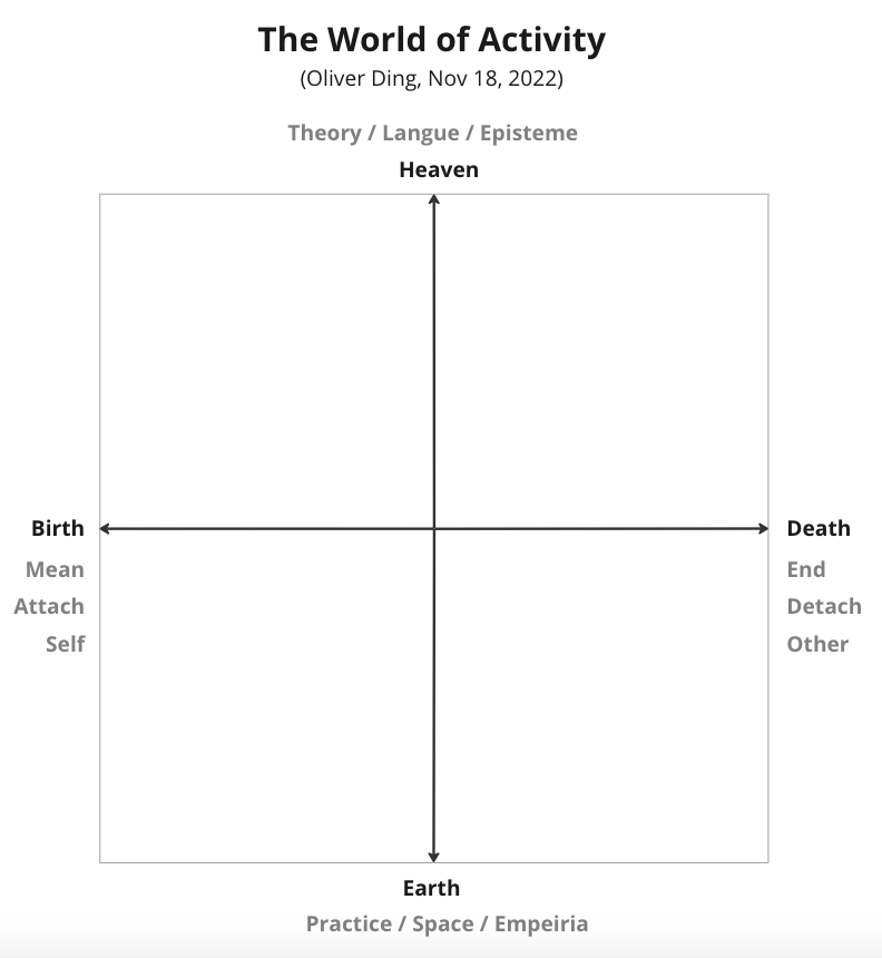 In the process of writing that book, something happened that I had not anticipated. The theoretical work and the life experience began to speak to each other in a way that felt new. I had been developing the concept of World of Activity — the idea that each person's life is bounded by fundamental givens, the aspects of existence that present themselves as already there, prior to any choosing. Inspired by phenomenological thinking and Chinese philosophical imagery, I had identified four such givens: Birth and Death, Heaven and Earth — or in the terms I was developing, language and culture above, environment and geography below, beginning and ending on either side.