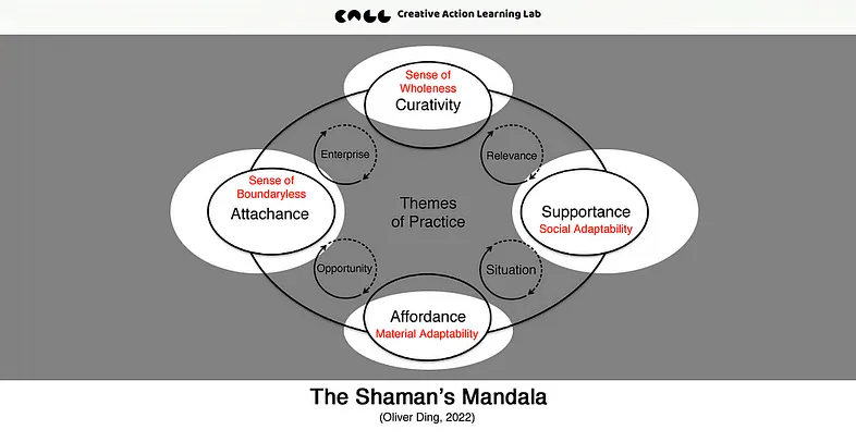 I was editing the negative frontiers article, going back to check some source material on the four boundaries of the World of Life framework. In the process, I rediscovered a diagram I had made in 2022 — the Shaman's Mandala — which maps four concepts from the Ecological Practice Approach onto a four-boundary structure: Affordance, Supportance, Attachance, and Curativity, each occupying a distinct position.