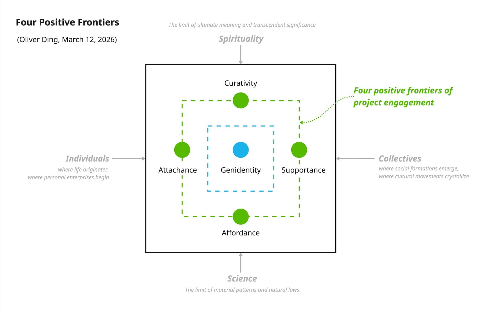 Why does Genidentity belong at the center? Because the four positive frontiers are not generic opportunities available to anyone in the abstract. They must be recognized and actualized by a particular actor in a particular situation. Without Genidentity, the four frontiers collapse into noise. With it, each becomes genuinely navigable.