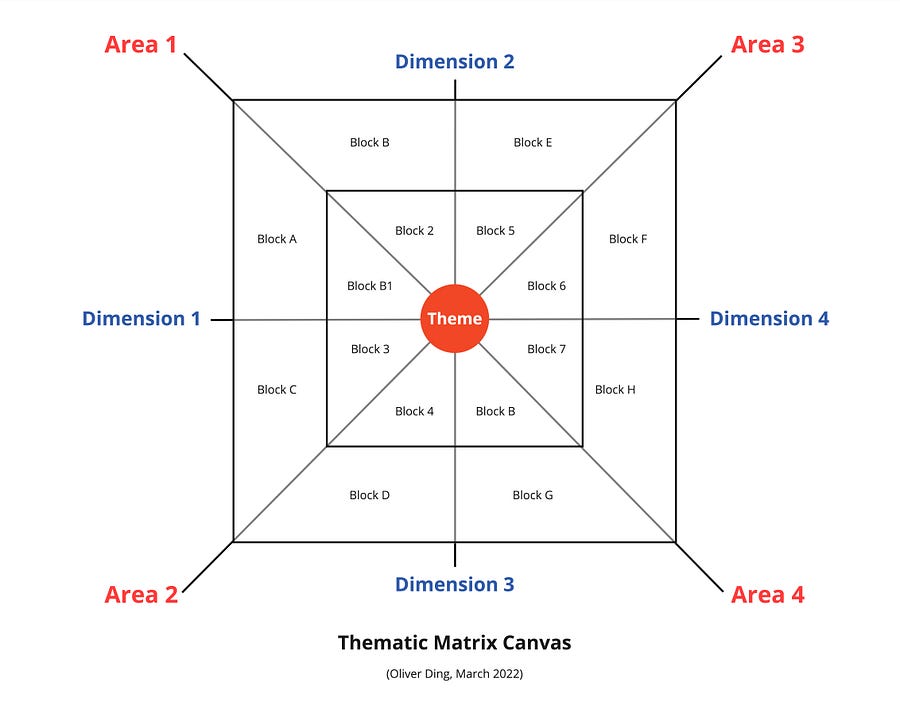 The Thematic Matrix Canvas was originally developed as a meta-canvas in early 2022. Over the past few years, I have used it to generate a series of canvases and applied them in numerous knowledge projects.