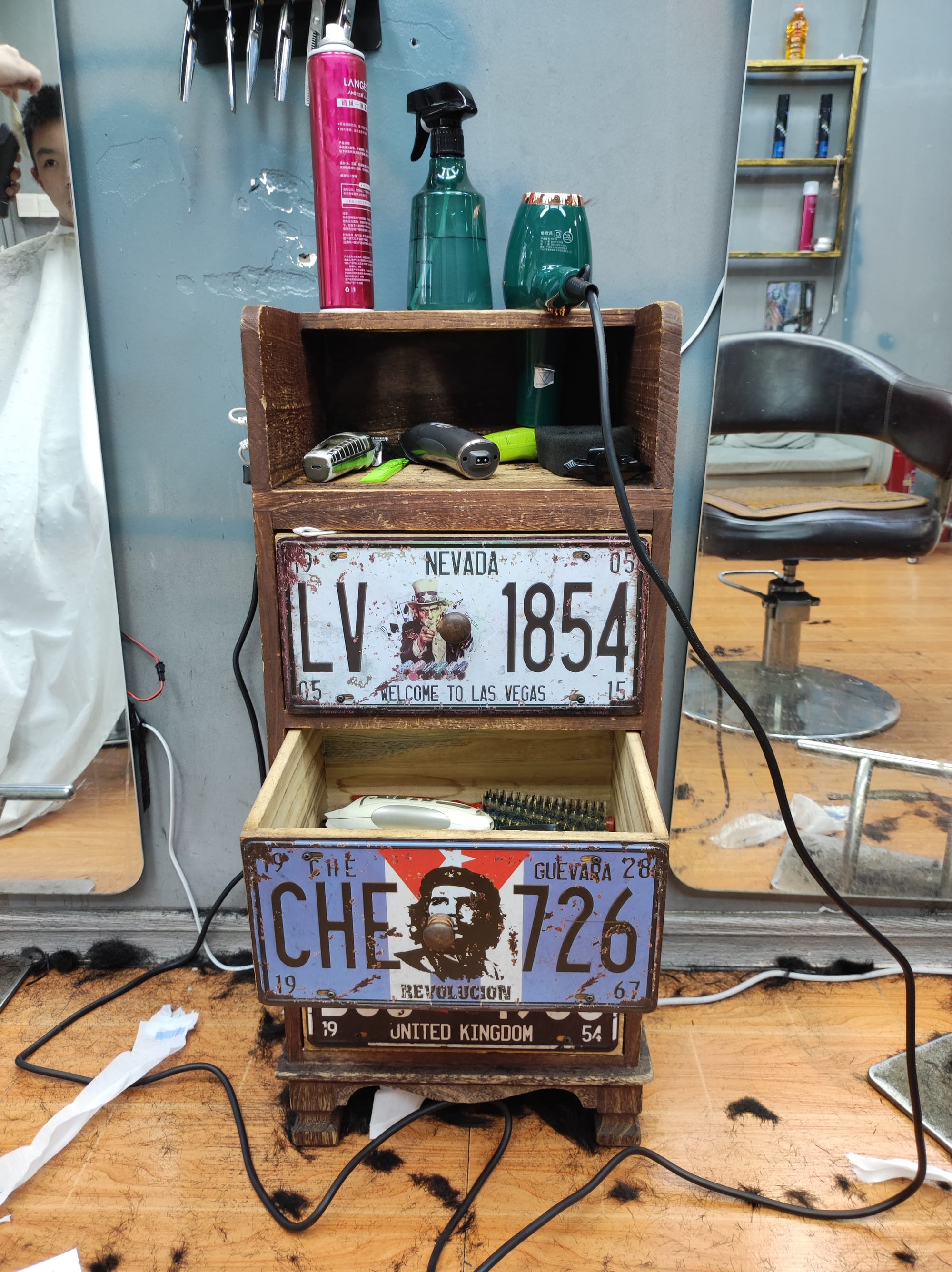 One day, while I was staying in Fuzhou, I went to a hair salon for a haircut. I was surprised that the owner used old American license plates as decoration. More interestingly, these plates featured cultural themes such as "LV 1854,""Che 726," and "BUS 1956."