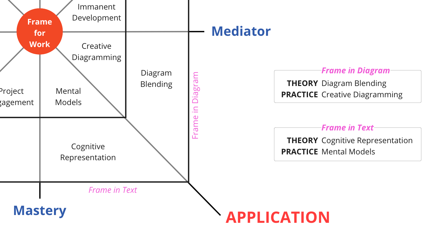 In the APPLICATION thematic area, the focus shifts to representing a cultural framework in real situations. The Frame-in-Diagram perspective highlights the value of diagrams and diagramming. I draw my book drafts on Creative Diagramming and Diagram Blending to explore this perspective.