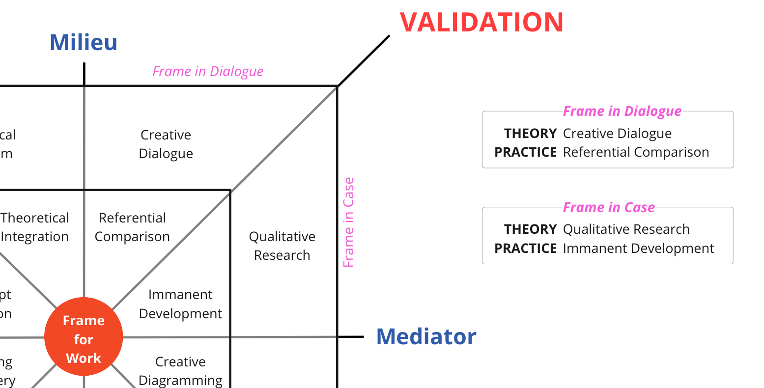 In the VALIDATION thematic area, I propose two ways of validation. The Referential Comparison practice refers to external validation. A cultural framework is established through comparison with other frameworks. A corresponding theoretical resource is the Creative Dialogue framework. This perspective is referred to as Frame-in-Dialogue.