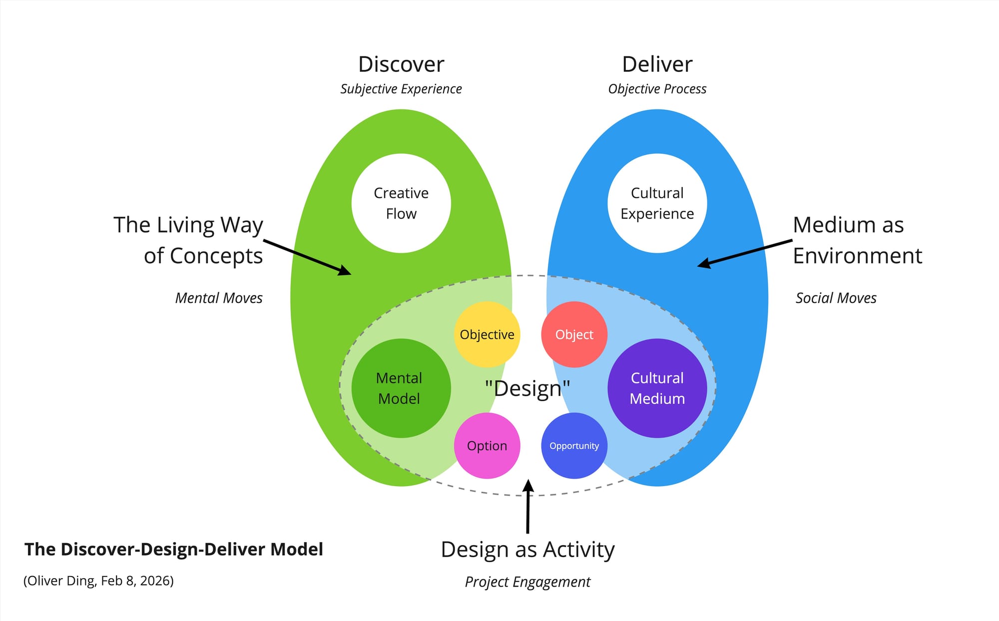 The Discover-Design-Deliver Model provides what the six ACS meta-frameworks could not: an operational middle layer that makes the core movement of cultural development concrete and actionable. DISCOVER develops Concept Systems through the Living Way of Concepts. DESIGN enacts the complex, sustained Activity through which Mental Models find their way into Cultural Medium. DELIVER is where Thematic Creation enters the social world and generates Cultural Experience across diverse environments. Together, the three containers give ACS both analytical precision and practical reach.