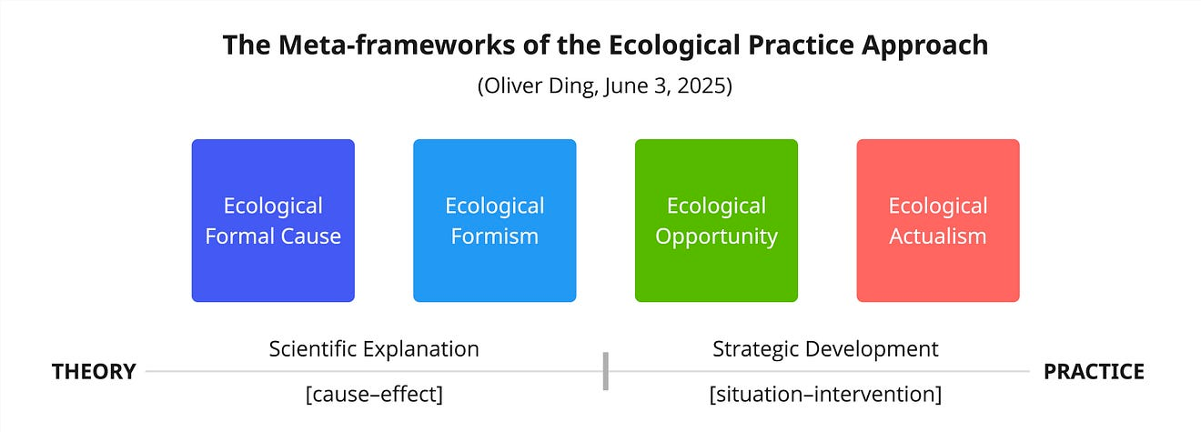 At the THEORY side, the approach is framed as a scientific project with two meta-frameworks: Ecological Formal Cause and Ecological Formism. On the PRACTICE side, it is presented as a practical project with two meta-frameworks: Ecological Opportunity and Ecological Actualism.