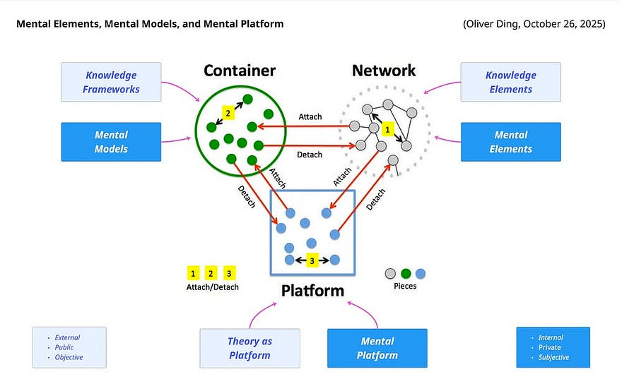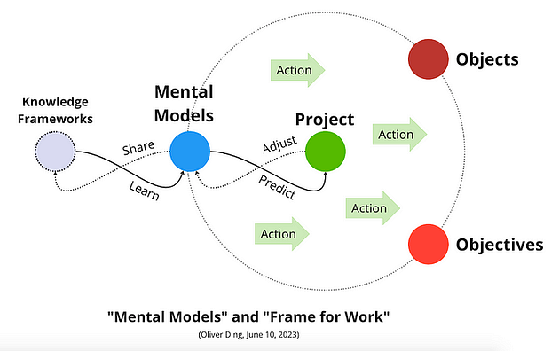 When a concept system supports the development of a Creative Enterprise, it functions as a Mental Platform. A Knowledge Framework can be internalized and transformed into Mental Models; in this movement, we detach from the outside space and attach to the inside space. Conversely, a Mental Platform can be externalized as a product, becoming a Theory as Platform. When a mental model is used to manage a project, it functions as a Predictive Model. When a series of mental models are used to manage a series of projects (an enterprise), they function as a Strategic Framework. In this way, the DDD model is a perfect operational framework of the Cultural Projection model.