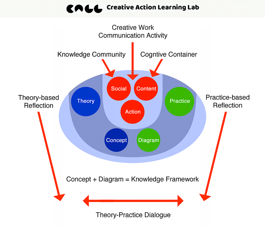 In the Echozone of this project, the fit between “Theory vs. Practice” is explored through three movements: Practice-based Reflection (building preliminary models using intuition), Theory-based Reflection (refining these models with theoretical resources), and Theory-Practice Dialogue (transforming models into frameworks and testing them through case studies). The fit between “Concept vs. Diagram” is captured in one formula: Concept + Diagram = Knowledge Framework.