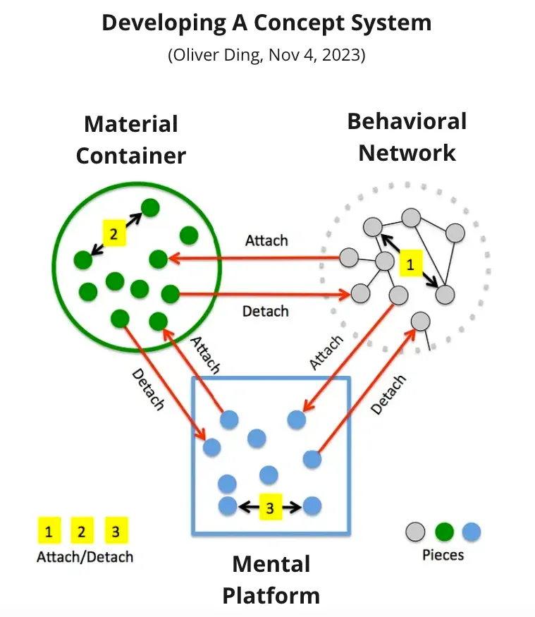 The Mindware Development approach emerged from the three-dimension model developed in 2023: Mental Platform → Material Container → Behavioral Network. This model provides a framework for understanding how concept-related products develop across three interconnected dimensions.