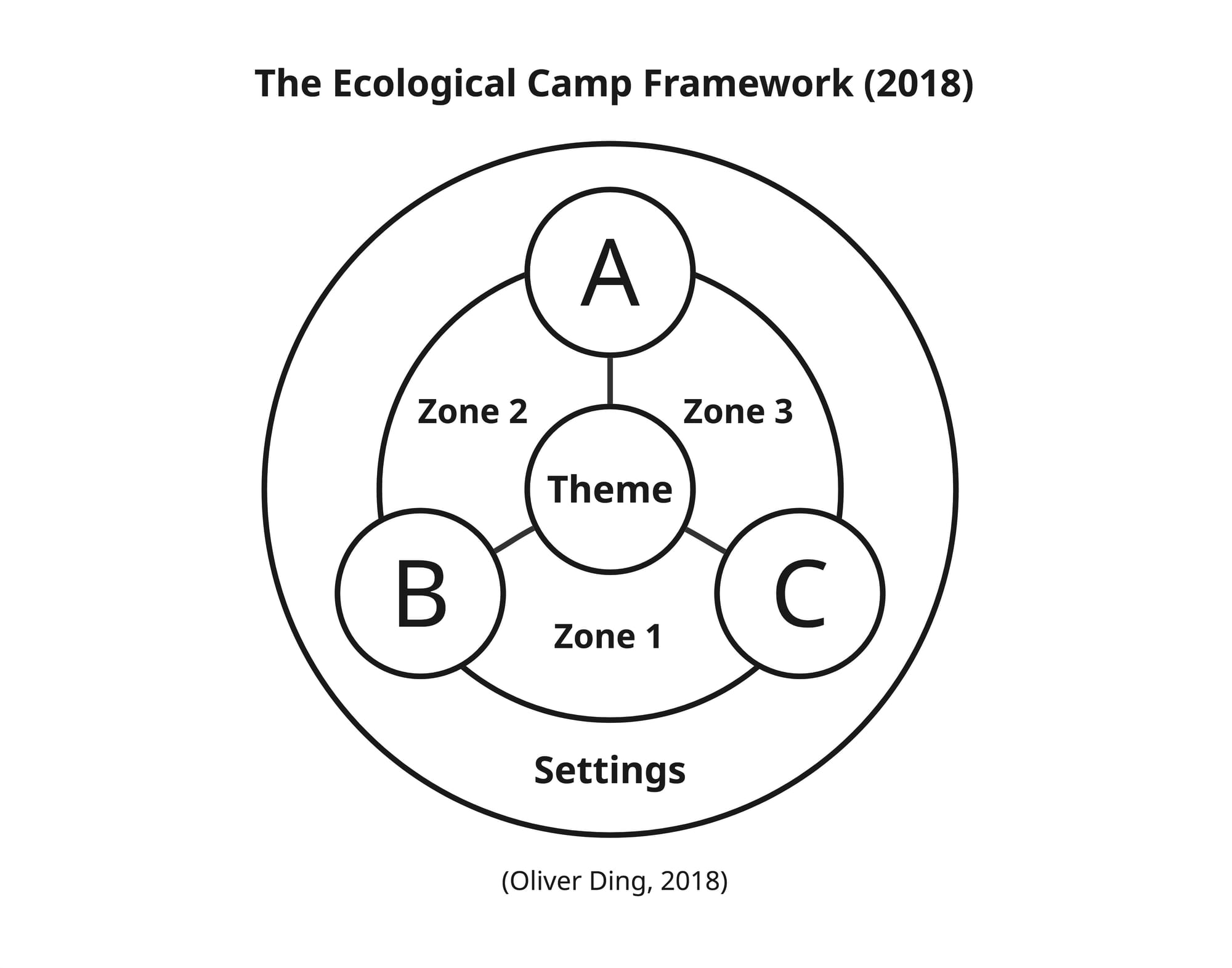 I typically apply the framework with at least three zones, which is called the Camp level. While the dyadic model represents the basic building block, the Camp level of the Ecological Zone Framework represents the standard usage and embodies its unique theoretical value.