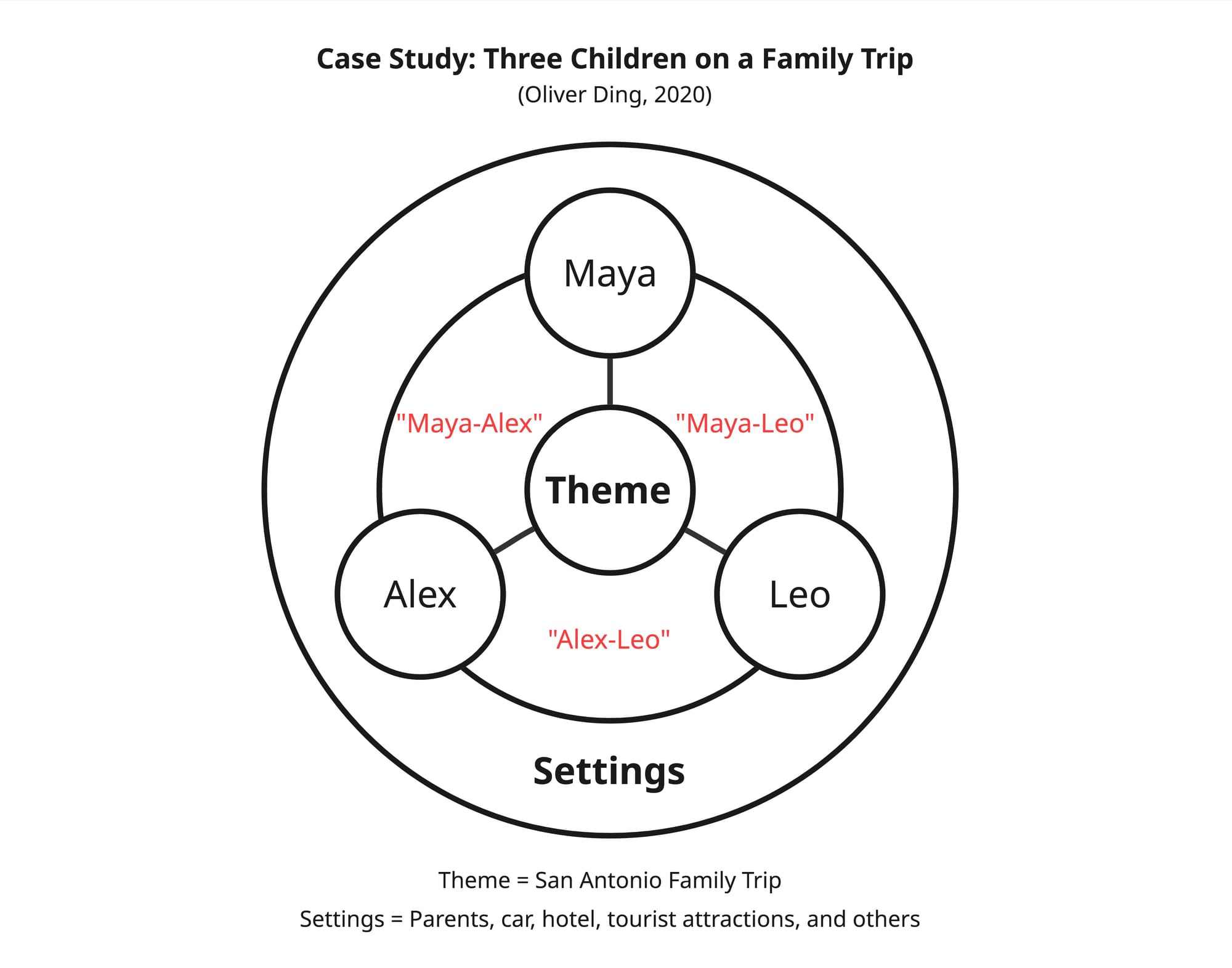 In this diagram, there are three Zones: "Maya-Alex," "Maya-Leo," and "Alex-Leo." Everything that happened among these three Zones during the entire "San Antonio Family Trip" can be represented in the diagram.