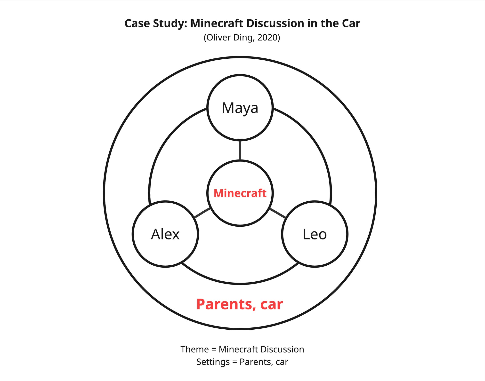 For specific single events, this diagram can also be used for in-depth analysis. For example, during the entire "San Antonio Family Trip," these three children did one thing: they discussed the Minecraft game while riding in the car. I drew a new Camp diagram specifically for this event.