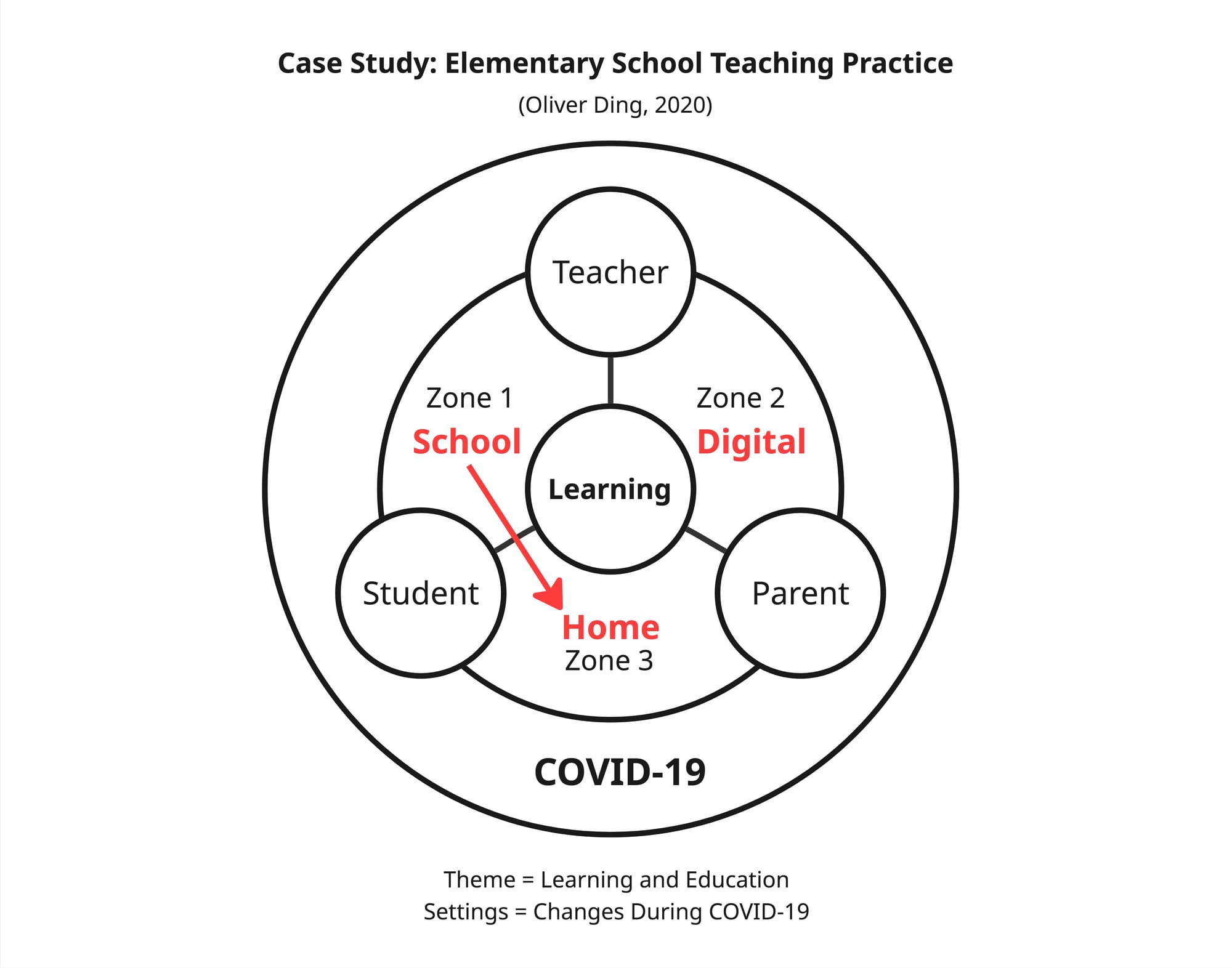 The diagram describes changes in elementary school teaching practice in the Houston Independent School District (HISD) during the COVID-19 pandemic in 2020. My children attended an elementary school in HISD, and I gained these insights while accompanying them in at-home schooling during that period. Therefore, these changes are limited to the HISD situation at that time.