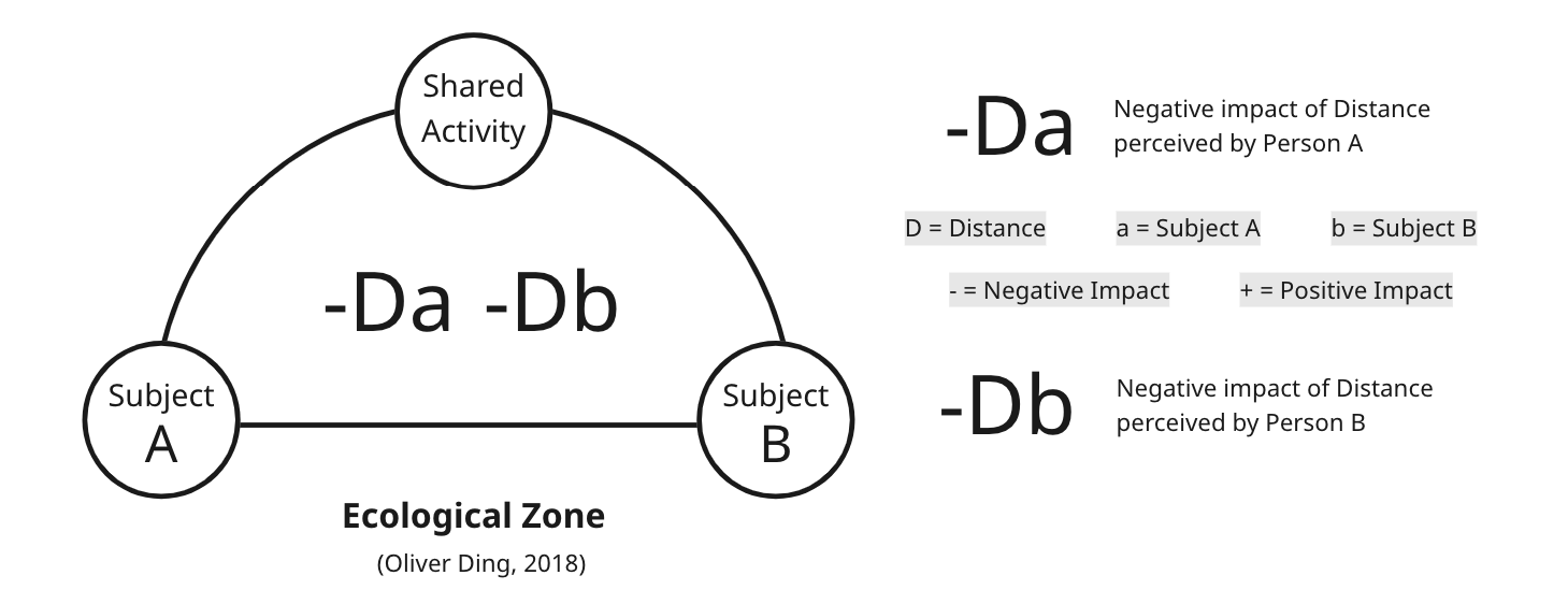 In 2018, I developed the Ecological Zone Framework to highlight a new theoretical creative space for an ecological approach to social interaction. The term "Ecological Zone" refers to an interactive space between two subjects engaged in a shared activity of short or long duration.