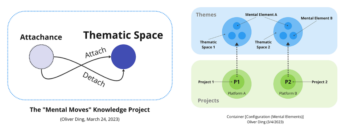 In this framework, a thematic space refers to a cognitive space containing an abundance of creative elements centered around a particular theme. It is not a solid construction but a dynamic and developmental space — like a lake and its water flows. For the present discussion, a creator’s cognitive landscape is strategically curated into a network of thematic spaces in order to serve the needs of project engagement across different scales: the enterprise level (a series of projects), the project level (a particular project), and the action level (a concrete task under a project).