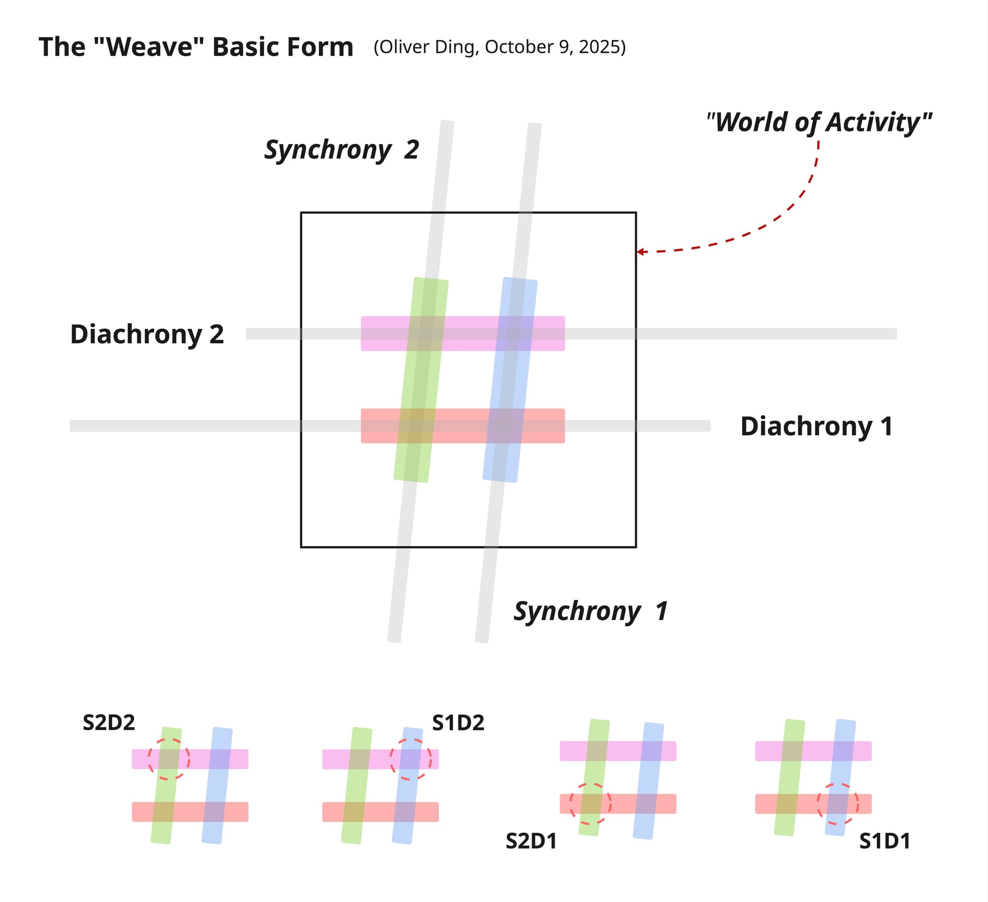 This is a super-simple diagram that frames the activity within the World of Activity as the synthesis of two diachronical dimensions and two synchronical dimensions. The model consists of four Weave-points (S1D1, S1D2, S2D1, S2D2), each representing a structural nexus where one synchrony dimension intersects with one diachrony dimension.
