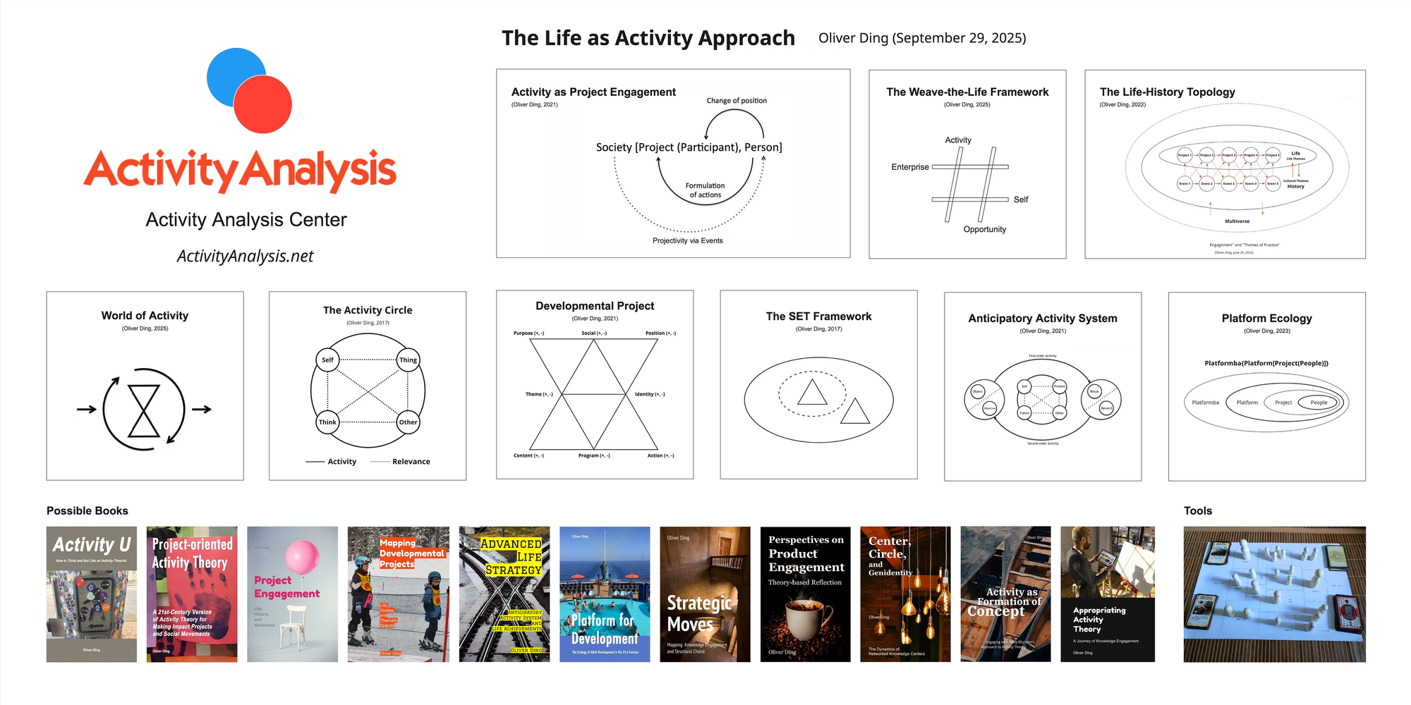 The diagram presents a landscape of the Life-as-Activity approach, encompassing nine knowledge frameworks, eleven book drafts, and one tool.