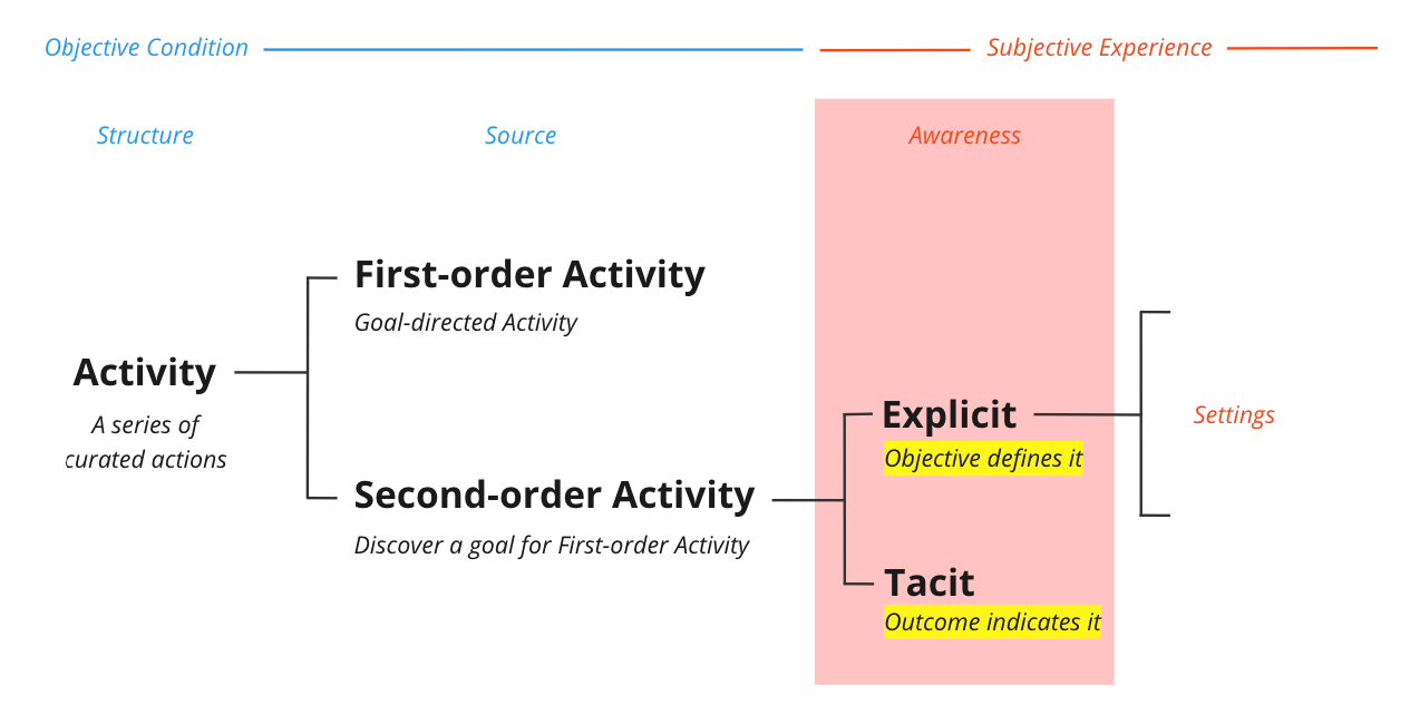 In such situations, Second-order Activity emerges. Its purpose is to discover a suitable objective or goal for a subsequent activity—that is, for a First-order Activity.