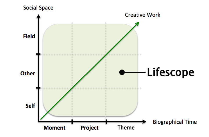 I drew the above diagram to visualize the notion of “Lifescope”. There is a dimension called Social Space behind “Self → Other → Field” and “Moment → Project → Theme” refers to another dimension called Biographical Time. These two dimensions define a creative person’s Lifescope.