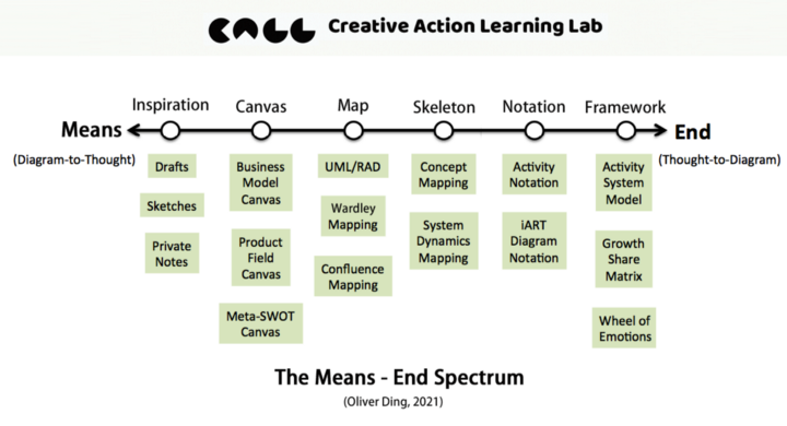From the perspective of Activity Theory, I consider the Means-End issue within concrete activities. For a particular activity, an object such as a diagram might be an end, I call it Thought-to-Diagram. For another particular activity, the same diagram might be a means, I call it Diagram-to-Thought. If we combine these two situations together, we can develop a Means-End Spectrum and use it to present various instrumental values of diagrams.