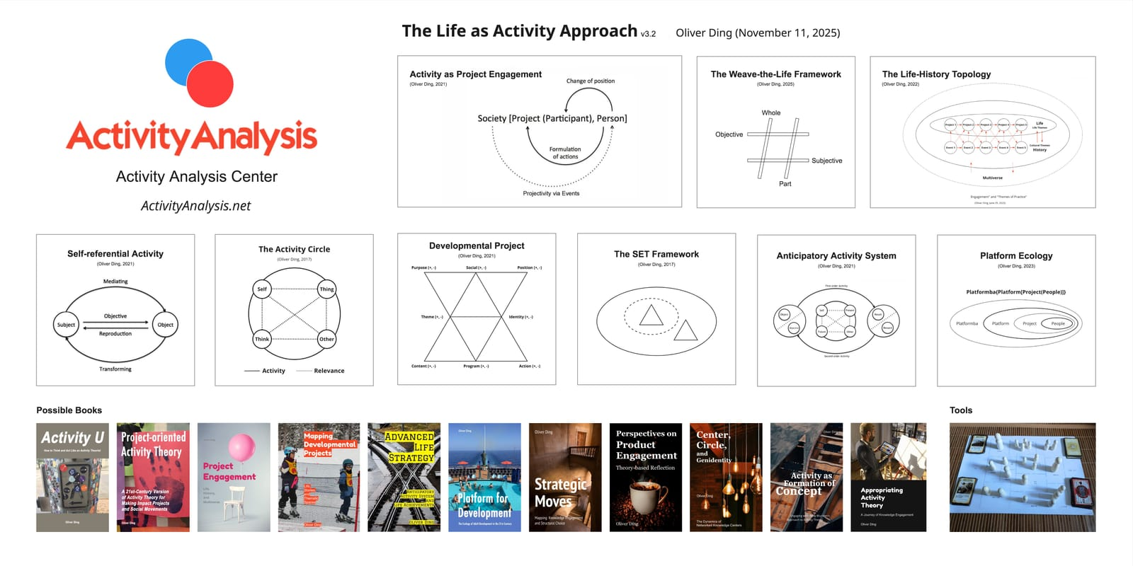 The theoretical framework underlying this collection is the Life-as-Activity Approach (v3.2, 2025) — a family of activity-centered knowledge frameworks developed over the past decade. Its name echoes a founding intuition of Activity Theory itself: Leontiev once considered calling his framework "Life Theory," before settling on "Activity" as a more analytically precise term. The Life-as-Activity Approach recovers that original ambition, treating life — both individual and social — as a form of activity.