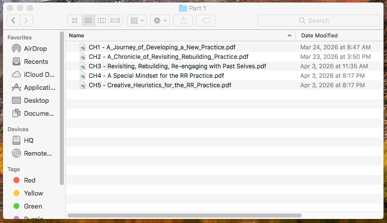 Part 1: A Creative Journey documents the development of the RR practice itself — how it emerged from an editorial constraint, how it evolved from revisiting into rebuilding, how it became a research project, and how the recognition of past selves arrived as its deepest discovery. This is the story of where this book came from.