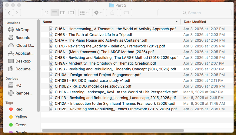 The seven cases are not uniform. The first two — A Thematic Trip and Activity as Container — were written before the RR research method had fully crystallized, and carry a more essayistic character. The remaining five — the LARGE Method, Mindentity, the DDD Model, the Learning Landscape, and the Significant Themes Framework — are formal case studies produced after the method's establishment in January 2026, with increasing analytical precision and comparative depth.