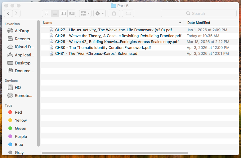 The final two chapters bring the Weave tools to bear on the question of creative identity development. The Thematic Identity Curation Framework and the Aion-Chronos-Kairos Schema together provide the methodological apparatus for curating life themes and identities across the dimensions of time — connecting the analytical tools of Part 6 to the theoretical framework of Part 5, and closing the circle of the collection.