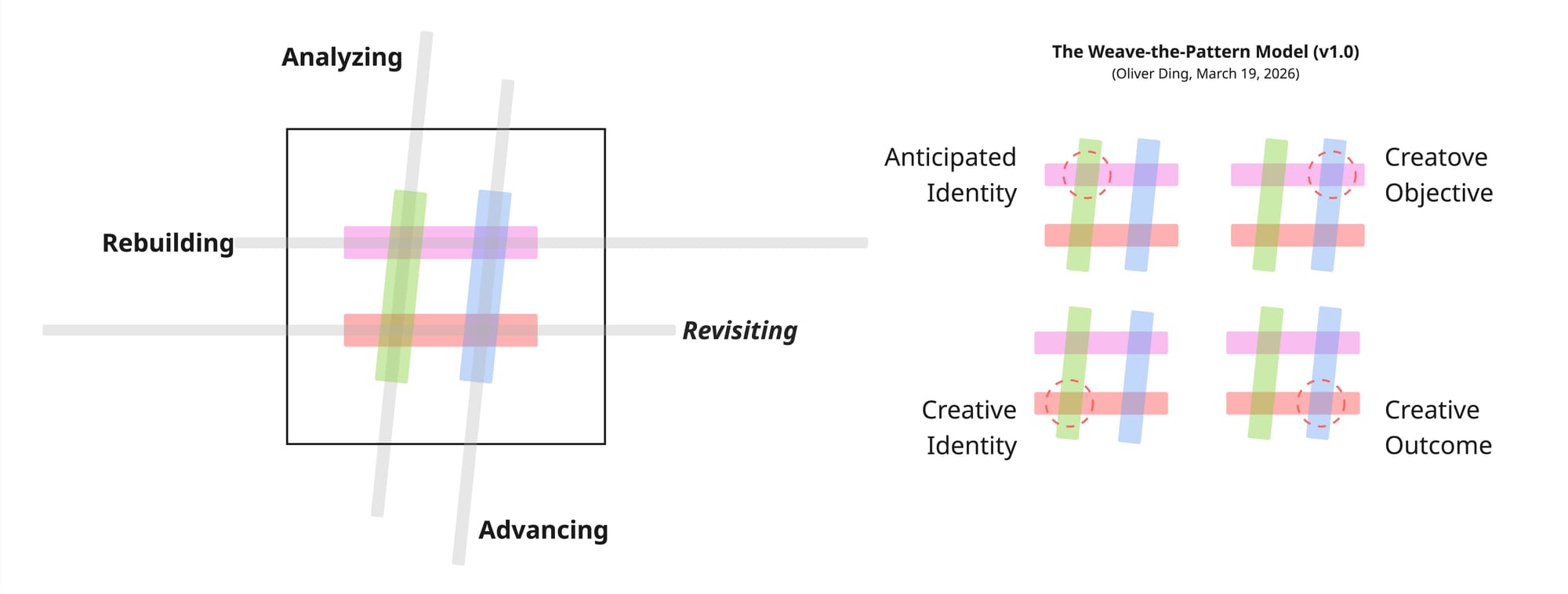 The four weave-points form a complete operational cycle. A creator engaged in Revisiting-Rebuilding simultaneously: recognizes past Creative Outcomes that carry dormant potential; reactivates past Creative Identities that have been forgotten; operates on a Creative Object that gathers both past and present materials; and develops clarity about the Anticipated Identity toward which the whole movement is oriented.