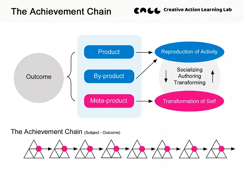 The first is Yrjö Engeström's Activity Systems Model (1987), which defines the activity system through the relationship between Subject, Object, Mediating Artifact, Community, Rules, Division of Labor, and Outcome. Within this model, the Achievement Chain focuses specifically on the Subject–Outcome relationship — the question of what a person actually produces through their activity.