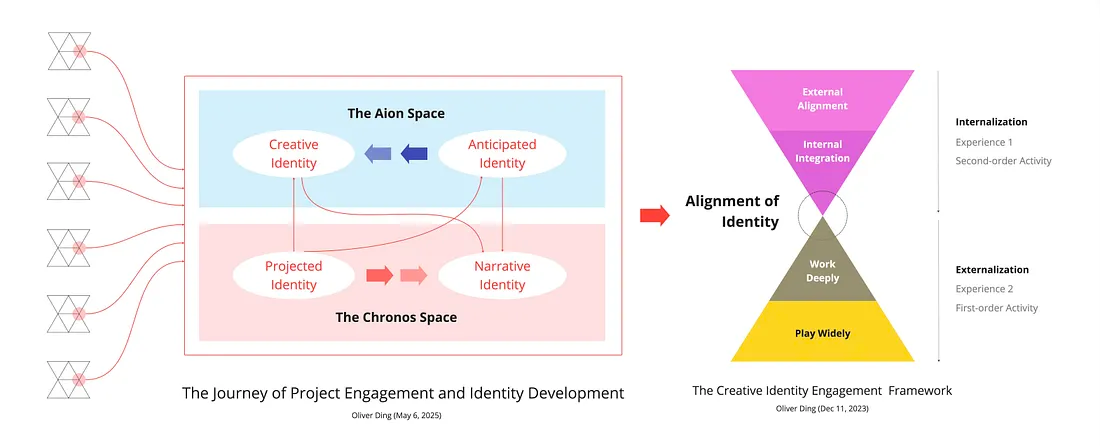 - Projected Identity — identity shaped by external roles and responsibilities in collaborative projects. This is the working identity that emerges through engagement in collective efforts, where roles and responsibilities are defined in relation to a shared project goal. It is how an individual is perceived and situated within the context of the project.
