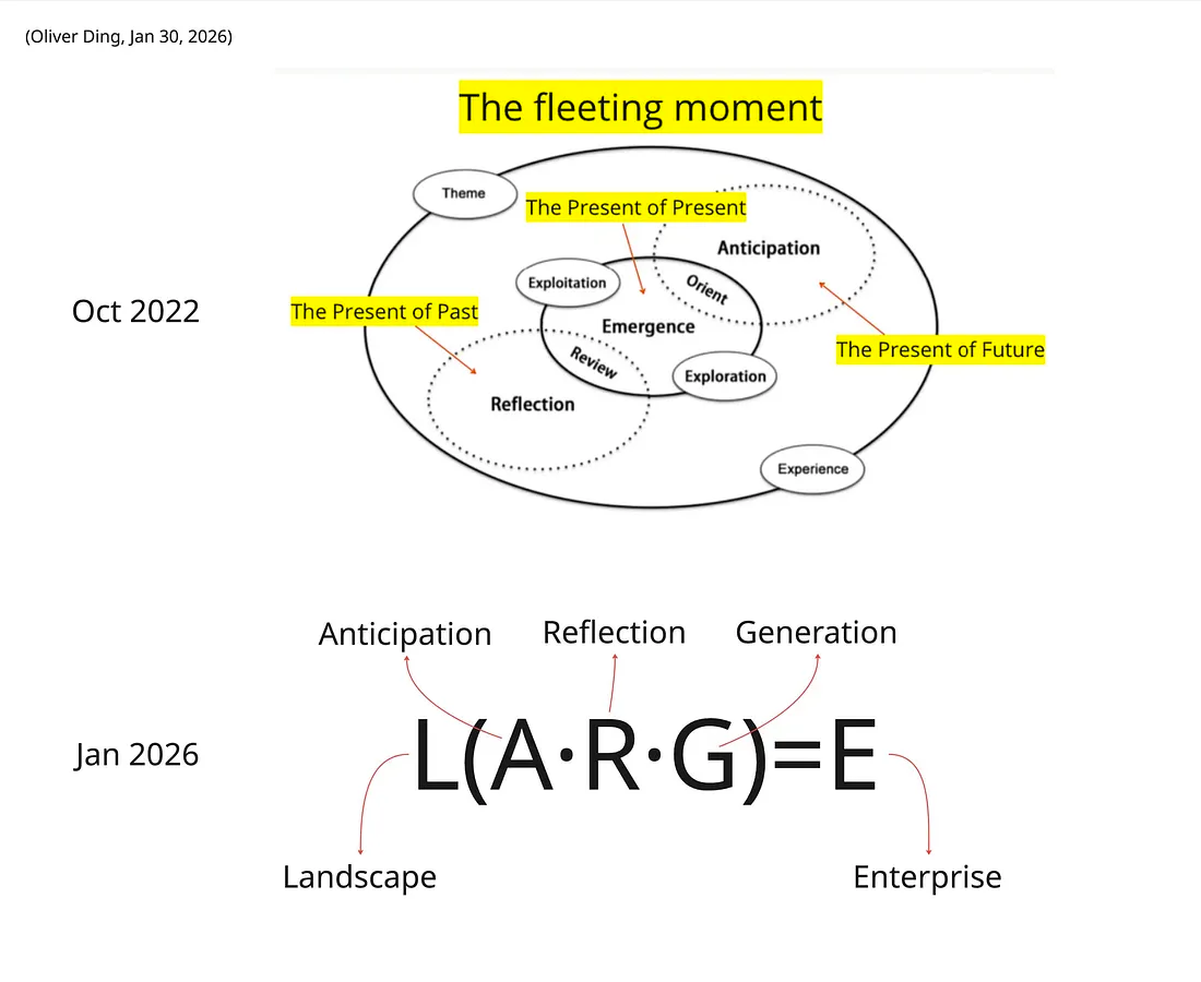 Eight years later, in January and February 2026, the LARGE Method returned — but transformed. It was now a governing meta-method: a formula, L(A·R·G)=E, organizing five methodological principles (Landscape, Anticipation, Reflection, Generation, Enterprise) across twelve methods distributed in four thematic spaces.