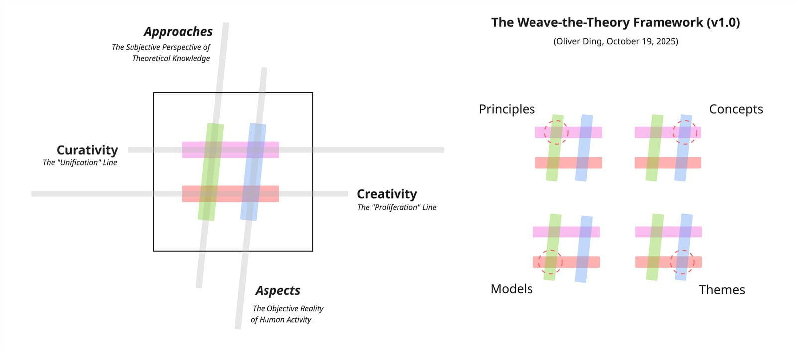 The contributions of this article can be summarized through the Weave-the-Theory Framework — a model for understanding how theoretical work unfolds across two axes: a Creativity line (Proliferation) operating at the concrete level of themes and models, and a Curativity line (Unification) operating at the abstract level of concepts and principles. The intersection of these two axes produces four weave-points, each naming a distinct layer of theoretical contribution.