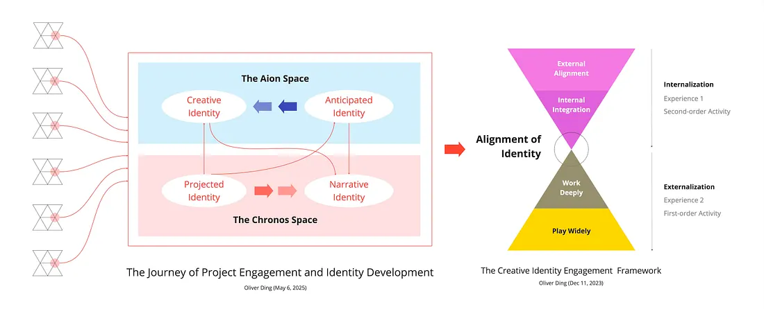 - Creative Identity — the identity enacted through concrete actions guided by autonomous will and subjective exploration. This is the Self of the present Activity Circle: who you are becoming through what you are making right now. It is the enacted Present Self.