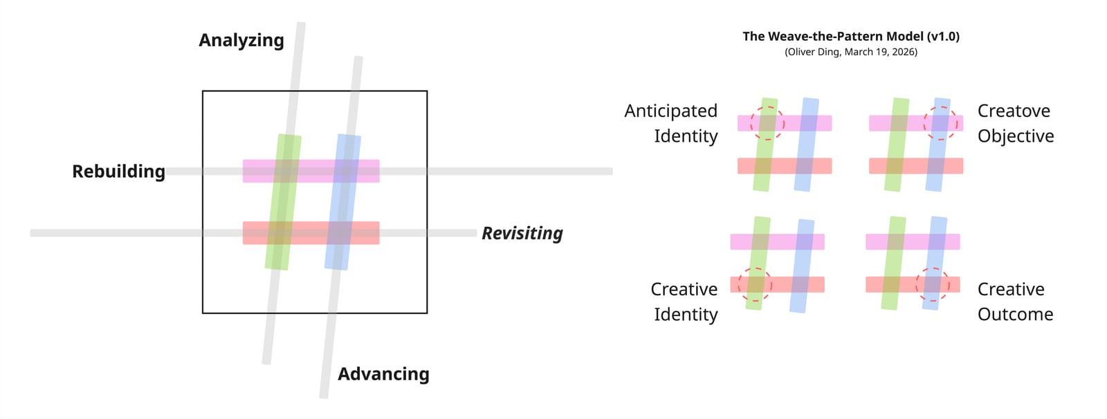 This weave structure is what makes Revisiting-Rebuilding a comprehensive strategy rather than a simple technique. It simultaneously addresses past outcomes (Creative Outcome), past identities (Creative Identity), present work (Creative Object), and future orientation (Anticipated Identity). All four are engaged at once — woven together into the fabric of a creative life.