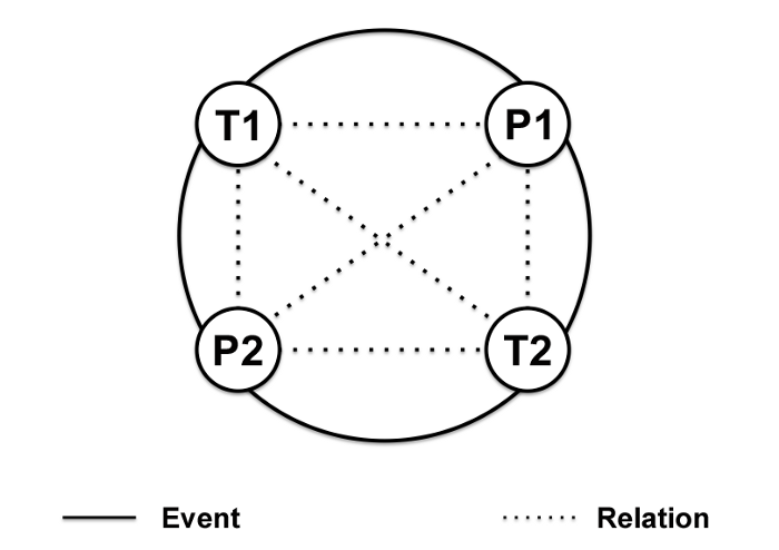 The "Activity as Container" project went further, becoming a reflection on my engagement with Activity Theory, Ecological Psychology, Distributed Cognition, and related social theories from 2014 to 2018. The final result was a 242-slide deck. The primary model it produced — the Thing-People Relation model — uses four nodes: T1 (Thing, Here), T2 (Thing, There), P1 (People, Here), P2 (People, There), enclosed within a circle representing a single event.