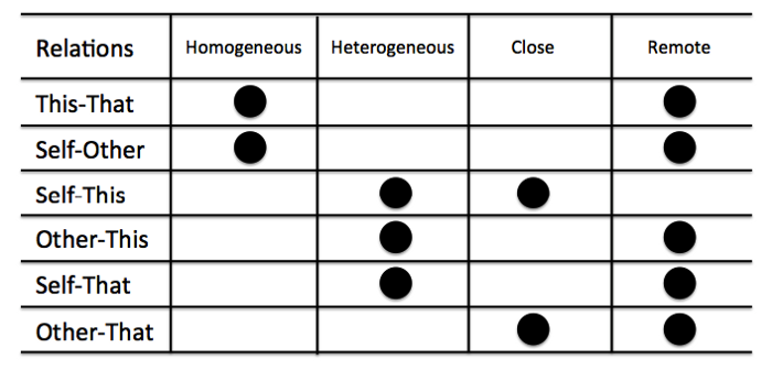 This meta-diagram identifies six types of relations organized across four dimensions. The pair Homogeneous–Heterogeneous refers to Categorical Difference; the pair Close–Remote refers to Spatial Difference. The six relation types — This-That, Self-Other, Self-This, Other-This, Self-That, Other-That — emerge from different configurations of these two dimensions.