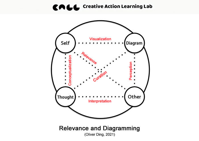 Following the Typology of Relevance, I constructed a companion model: the Relevance and Diagramming model. Inspired by the Thing-People Relation model, it shares the same four-node circular structure with Self and Other as two of its poles — but the other two nodes, Diagram and Thought, are not homogeneous objects of the same kind. Diagram is an external visual artifact; Thought is an internal mental content. The structure is borrowed; the nodes are transformed.
